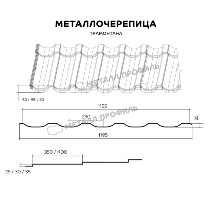 Со стальной черепицей ТРАМОНТАНА ваша кровля будет заметна издалека! Указанный профиль притягивает взгляды симметричными волнами с высотой ступени 25, 30 или 35 мм и длиной 350 либо 400 мм. Благодаря усиленному рельефу этот кровельный материал можно эксплуатировать даже в суровых климатических условиях. Это глубокий профиль (50, 55 и 60 мм), который оберегает кровлю от порывов ветра. Вы можете комбинировать глубину профиля, длину, высоту ступеней, создавать необычные варианты кровли.